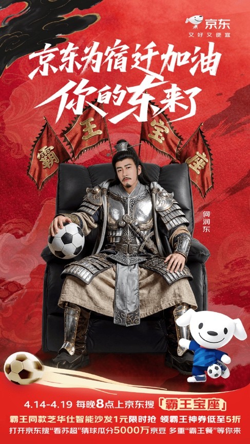 近日,因在经典剧集《楚汉传奇》中成功塑造“西楚霸王”项羽一角而再度火爆出圈的著名演员何润东,引发网友集体回忆杀。大量网友自发喊话“请霸王回家”,希望他为正在火热进行的“苏超”联赛助阵。面对这波热情高涨的呼声,一向“听劝”的京东迅速响应,直接为宿迁请来了何润东,携手宿迁文旅共同向他发出正式邀请,并官宣他将于4月18日以项羽经典造型空降宿迁奥体中心,为“霸王故里”宿迁队加油打气。针对网友“想看何润东穿项羽服装上场”的留言,京东方面透露,“霸王铠甲”已在加急制作中,还准备了“霸王宝座”静候霸王归位,力求以最还原、最震撼的方式,让“西楚霸王”真正回乡助威。