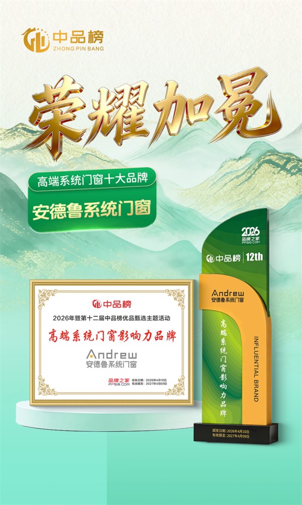 2026年4月1日,备受行业瞩目的第十二届"中品榜"优品甄选活动圆满落幕,各大品类十大品牌榜单正式揭晓。在竞争激烈的高端系统门窗领域,安德鲁系统门窗凭借其德系精工底蕴、硬核技术实力与市场广泛认可,成功斩获"高端系统门窗十大品牌"荣誉,为品牌发展历程再添浓墨重彩的一笔。