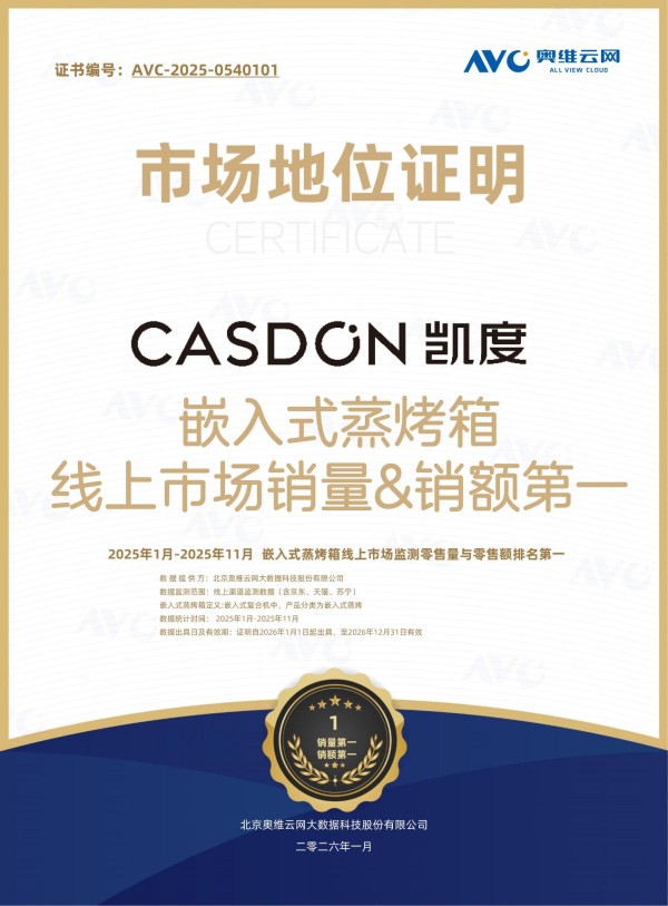 奥维云网数据显示,凯度电器成功斩获2025年1-11月嵌入式蒸烤箱线上市场销量&销额第一,充分印证了凯度在行业内的领先地位,以及市场与行业的双重认可。